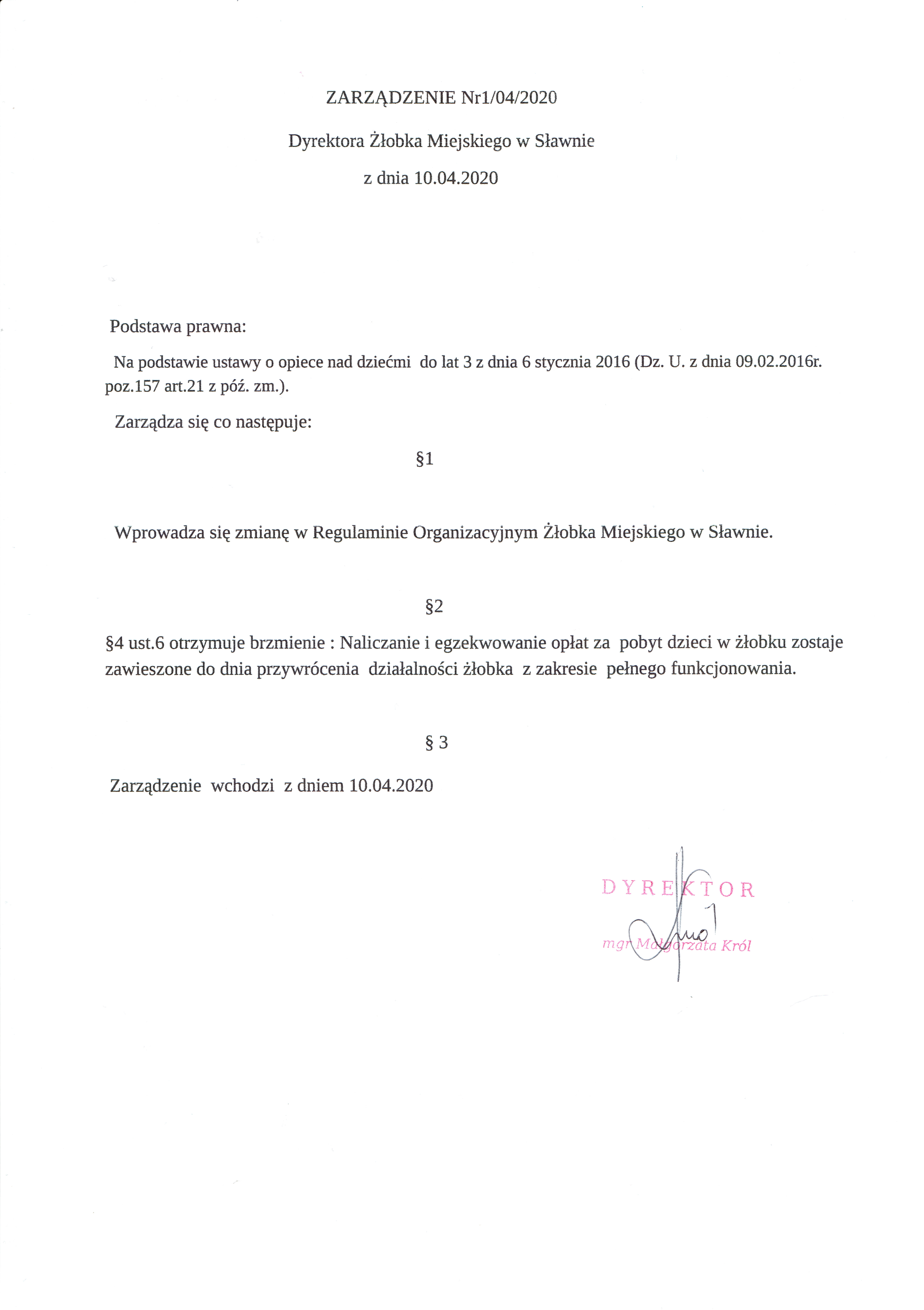Zarządzenie nr 1/04/2020 Dyrektora Żłobka Miejskiego w Sławnie